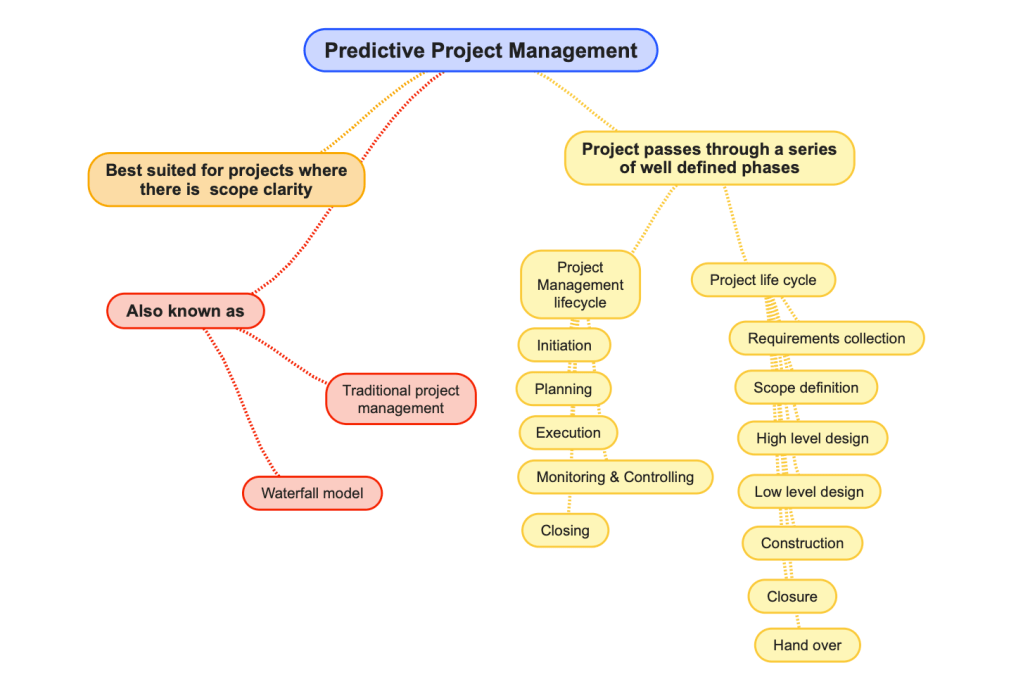 Predictive project management is also known as traditional project management or waterfall model. Predictive projects passes through logical phases (project life cycle) of;